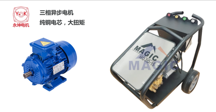As shown in the figure is a cold water high-pressure cleaner. The motor used in the high-pressure cleaner is a three-phase asynchronous motor. The reason why three-phase asynchronous motor is used is that the output torque of asynchronous motor is large enough. The power is big, the pressure of the washing machine is enough, so that the cleaning equipment and so on can also achieve the effect of cleaning quickly. The design of this cleaning machine is as shown in the figure. The parameters selected on the motor can refer to the following: