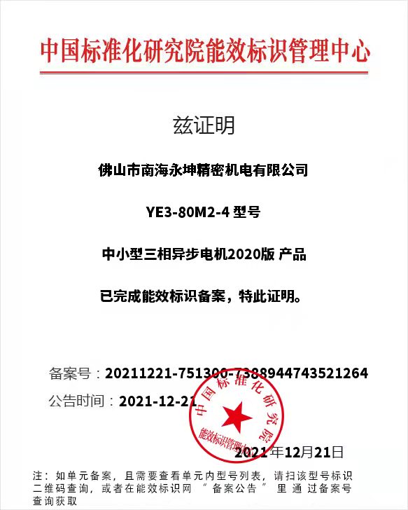 隨著國家強制能效標準啟動升級,重視能效約束也是企業提升競爭力的舉措之一。尤其是生產制造行業、節能減排、提升企業及設備的能效將是重中之重的任務了。佛山永坤電機公司一直以來都緊跟政府步伐、響應國家號昭,不斷提升中小型三相異步電動機能效標識。例如圖中展示的一款電動機YE3-80M2-4能效標識則為2020年版。對于電動機能效標號有著要求或是從事制造設備行業的,意在提升設備能效、提升設備附加值的,建議選用佛山永坤電機公司的新能效電動機。