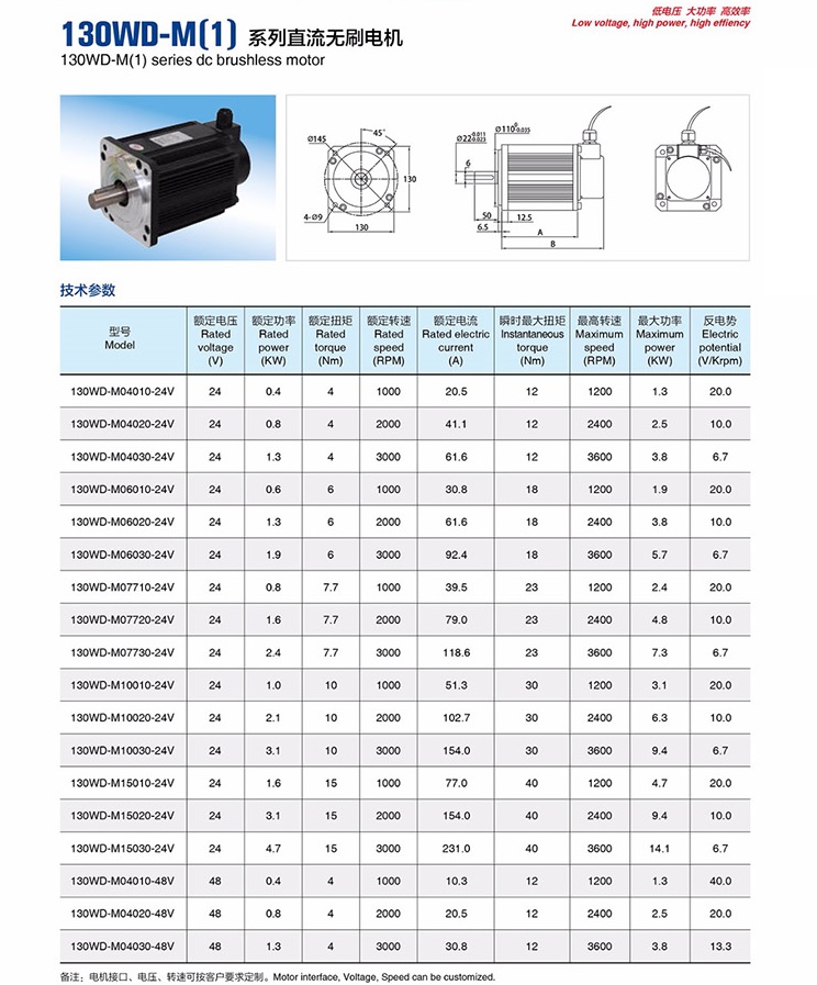 何為光軸無刷電機,即是指只有無刷電機的時候,而沒有帶減速機的時候,把無刷電機作為光軸無刷電機。帶了減速機的電機也稱作減速電機,多了一個電字,是指電機。如下圖為光軸無刷直流電機130系列的外形尺寸圖,通過以下尺寸圖我們也可以發現無刷電機相比其它種類電機,即使是在相同功率的情況下,無刷電機都是外形尺寸相當小的,這也是選用無刷電機的一大特點。即體積小,從而滿足設備對安裝空間有要求的情況。